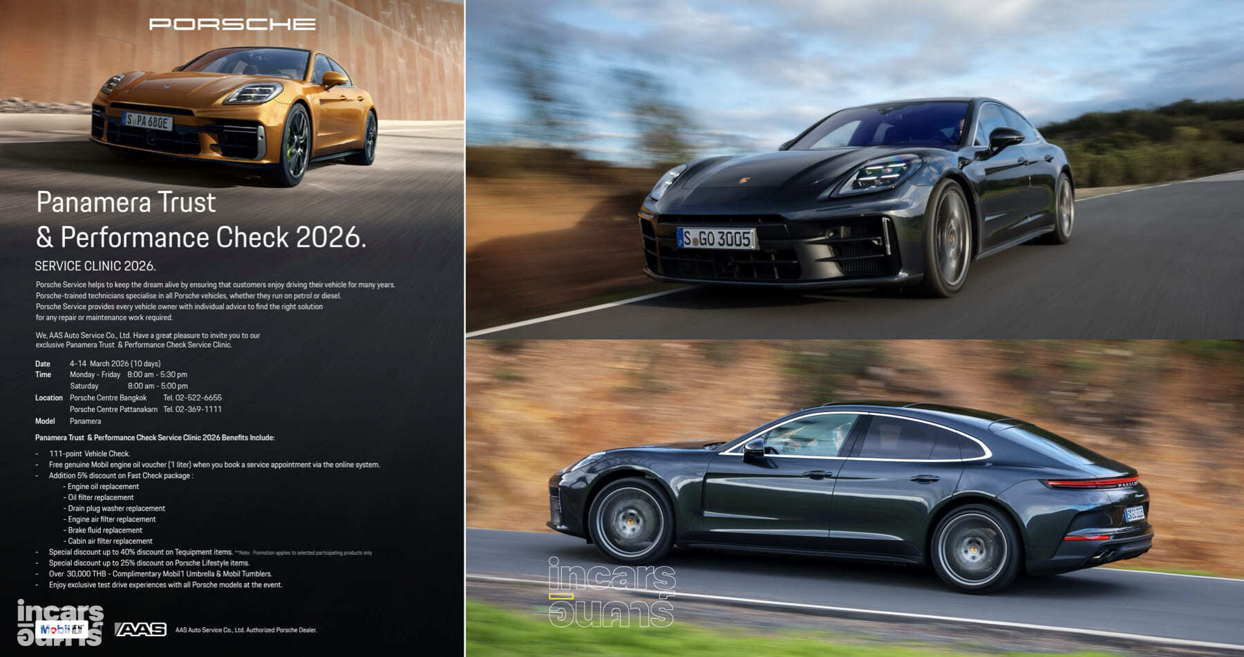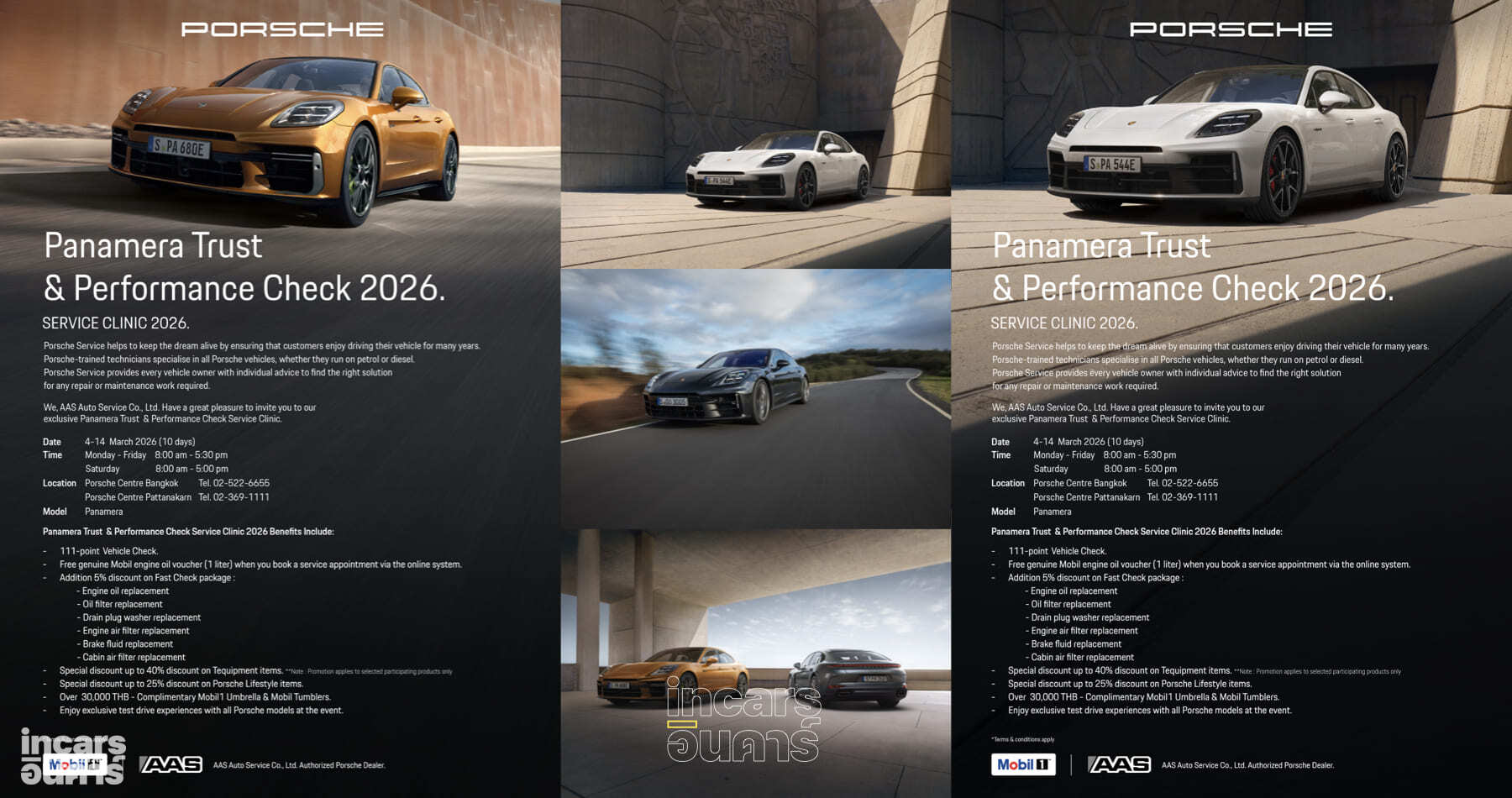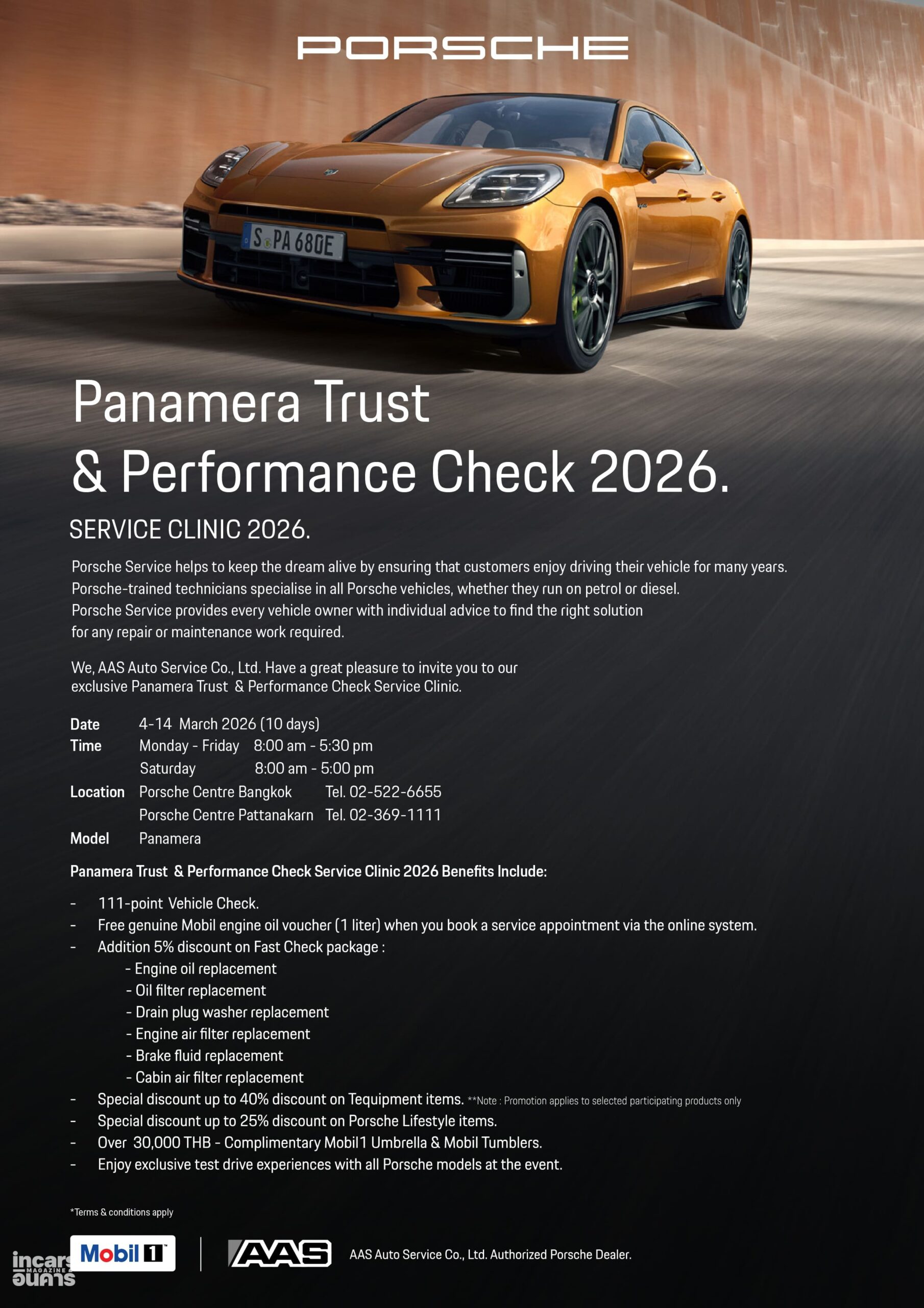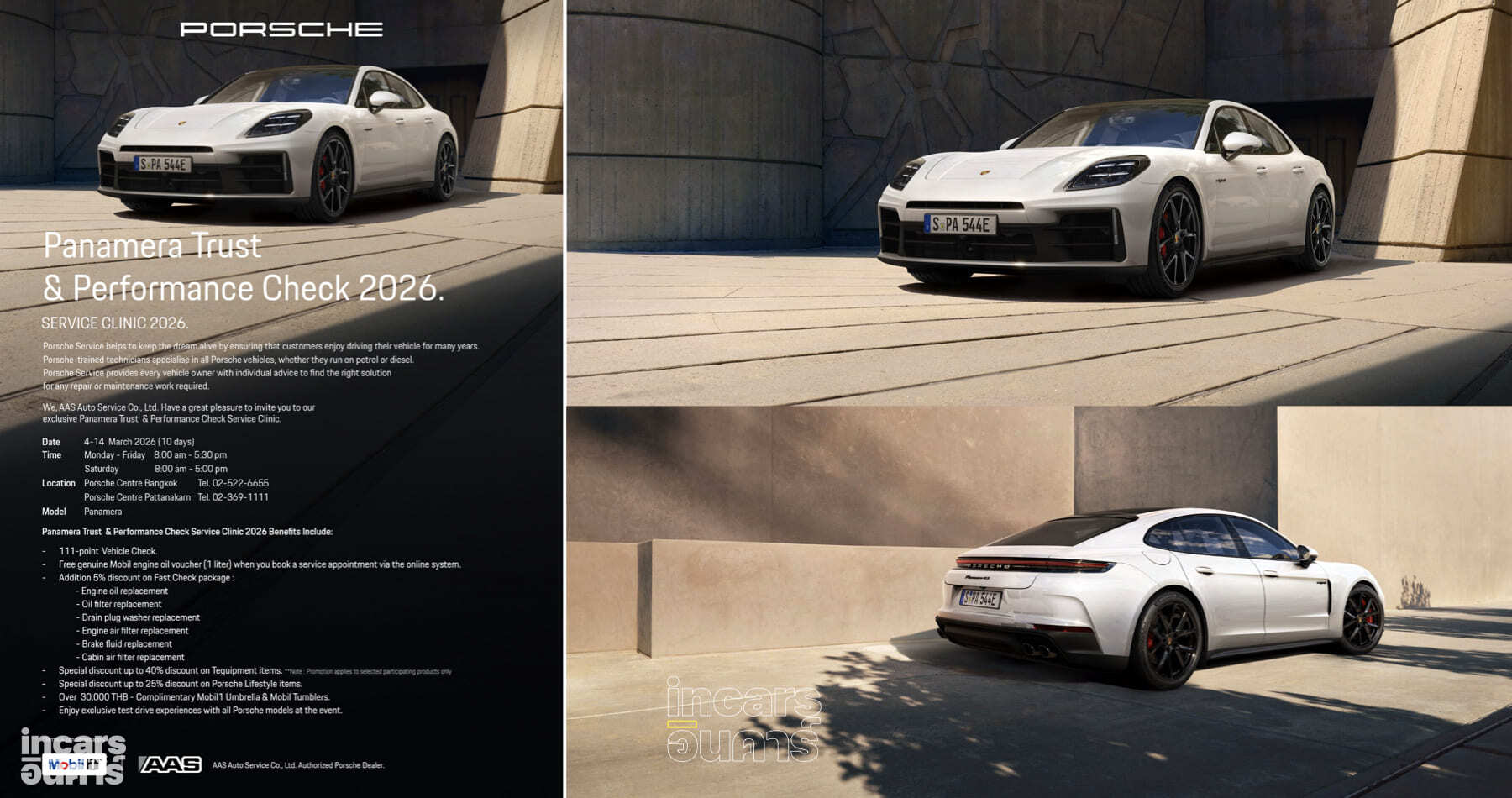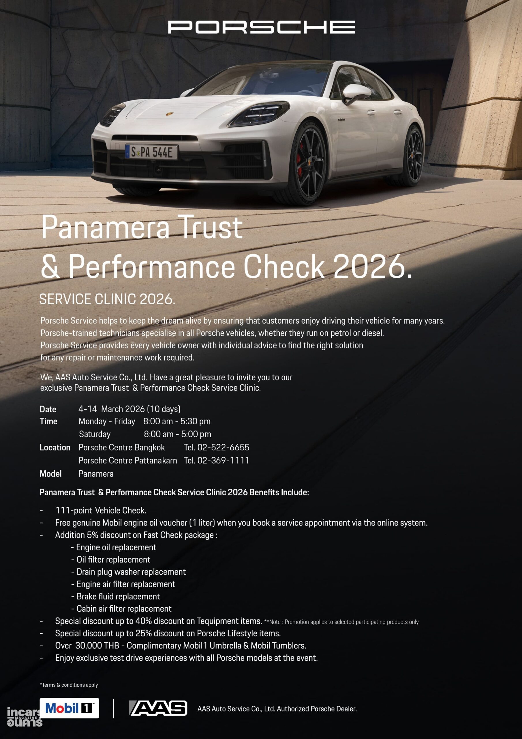 เอเอเอส ออโต้ เซอร์วิส ตัวแทนจำหน่ายรถยนต์ปอร์เช่อย่างเป็นทางการแห่งแรกในประเทศไทย ด้วยมาตรฐานศูนย์บริการระดับโลกจากโรงงานปอร์เช่ ประเทศเยอรมนี ผสานความเชี่ยวชาญของทีมช่างผู้ผ่านการรับรอง ขอเชิญเจ้าของรถยนต์ปอร์เช่รุ่นปอร์เช่ พานาเมร่า (Panamera) เข้าร่วมแคมเปญสุดพิเศษ “Porsche Service Clinic Panamera Trust & Performance Check 2026 ระหว่างวันที่ 4 – 14 มีนาคม 2569 ณ Porsche Centre Bangkok และ Porsche Centre Pattanakarn