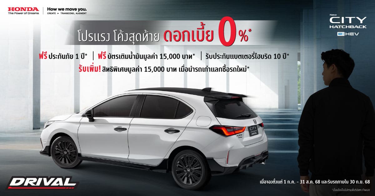 - เพิ่มเติม Happy Trade-in สำหรับ Honda City Hatchback DRIVAL เมื่อนำรถยนต์คันเดิมมาขายและออกรถยนต์ Honda City Hatchback DRIVAL ที่โชว์รูมฮอนด้า รับสิทธิพิเศษเพิ่มเติม มูลค่า 15,000 บาท** (เมื่อจองตั้งแต่วันที่ 1 กรกฎาคม 2568 – 31 สิงหาคม 2568 และรับรถภายในวันที่ 30 กันยายน 2568)