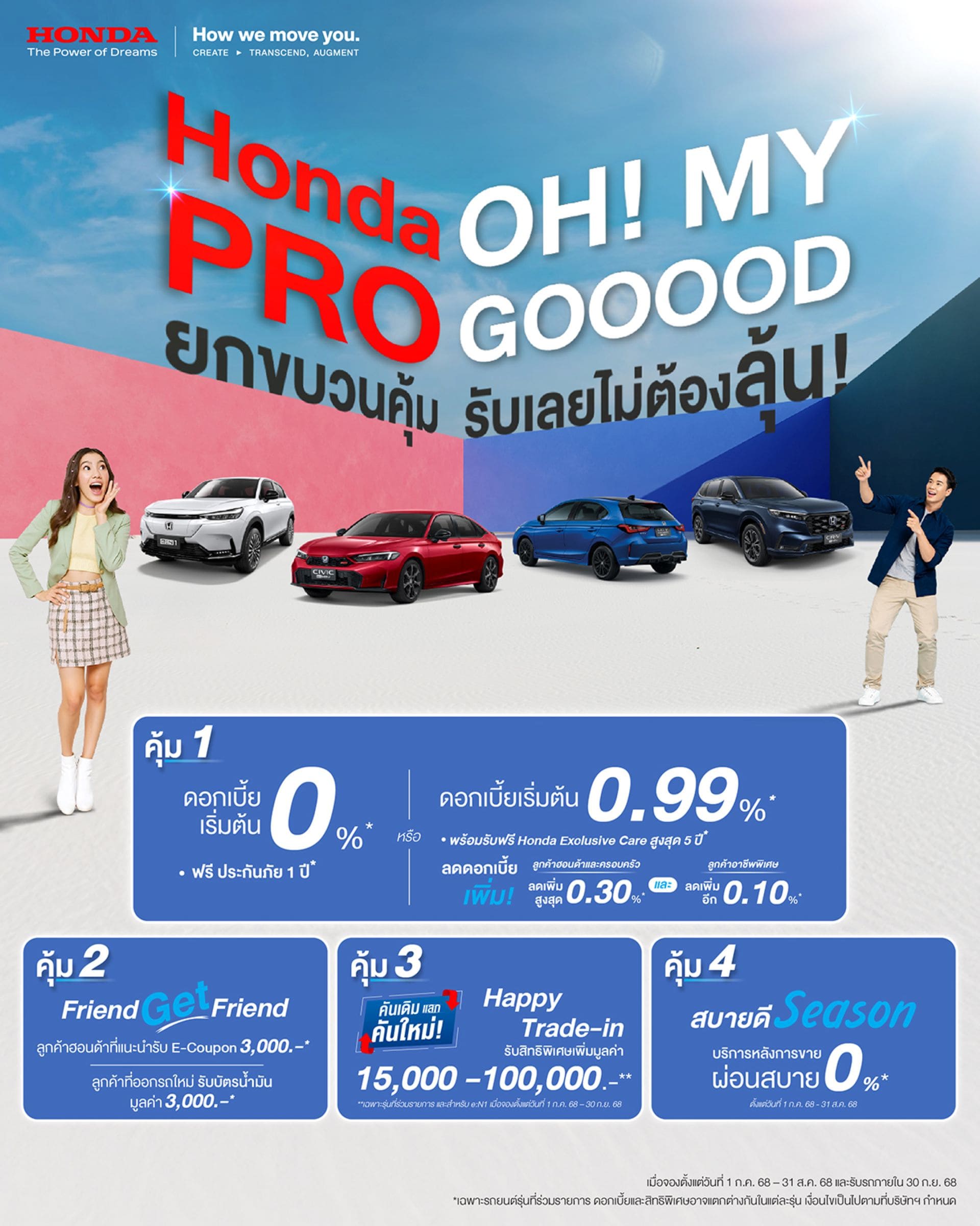 ข้อเสนอพิเศษสุดคุ้มสำหรับลูกค้าที่จองรถยนต์ฮอนด้าตั้งแต่วันที่ 1 กรกฎาคม 2568 – 31 สิงหาคม 2568 และรับรถภายในวันที่ 30 กันยายน 2568 นี้ รีบด่วน! ก่อนตกขบวนความคุ้ม มาสัมผัสรถคันที่ใช่ โปรฟีลกู้ดที่ชอบ ได้ที่งาน FAST Auto Show Thailand 2025 ตั้งแต่วันที่ 2-6 กรกฎาคม 2568 ณ บูทฮอนด้า (B2) ฮอลล์ 102 – 103 ศูนย์นิทรรศการและการประชุมไบเทค หรือรับข้อเสนอพิเศษเดียวกันได้ที่โชว์รูมฮอนด้าทั่วประเทศ