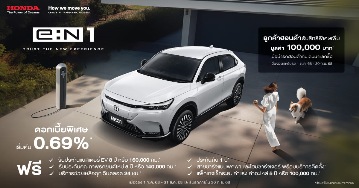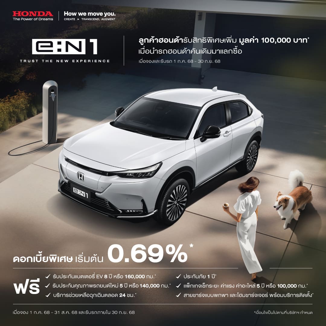 Honda e:N1 รถยนต์ไฟฟ้ารุ่นแรกจากฮอนด้า ดอกเบี้ยพิเศษ 0.69%* พร้อม Honda Exclusive Care 5 ปี และโฮมชาร์จเจอร์พร้อมบริการติดตั้งและสายชาร์จแบบพกพา (รวมมูลค่า 69,500 บาท*)ลูกค้าฮอนด้านำรถมา Trade-in รับสิทธิพิเศษมูลค่าสูงสุด 100,000 บาท วิ่งได้สูงสุด 500 กม.* ต่อการชาร์จ ดีไซน์โดดเด่น อัตราเร่งแรง ขับสบาย สมูทในทุกจังหวะ ราคา 1,199,000 บาท เชื่อมั่นตลอดการใช้งานด้วยการรับประกันแบตเตอรี่ EV และระบบขับเคลื่อน EV ทั้งระบบ 8 ปี หรือ 160,000 กม. พร้อมให้บริการและดูแลผ่านเครือข่ายผู้จำหน่ายทั่วประเทศ ด้วยศูนย์บริการที่ได้มาตรฐานและช่างผู้เชี่ยวชาญ มาพร้อมข้อเสนอพิเศษ ดอกเบี้ยพิเศษ 0.69% สำหรับเจ้าของรถยนต์และรถจักรยานยนต์ฮอนด้าและครอบครัว (Honda Loyalty) หรือรับดอกเบี้ย 0.99% สำหรับลูกค้าทั่วไป พร้อมรับ Honda Exclusive Care 5 ปี และโฮมชาร์จเจอร์พร้อมบริการติดตั้ง และสายชาร์จแบบพกพา