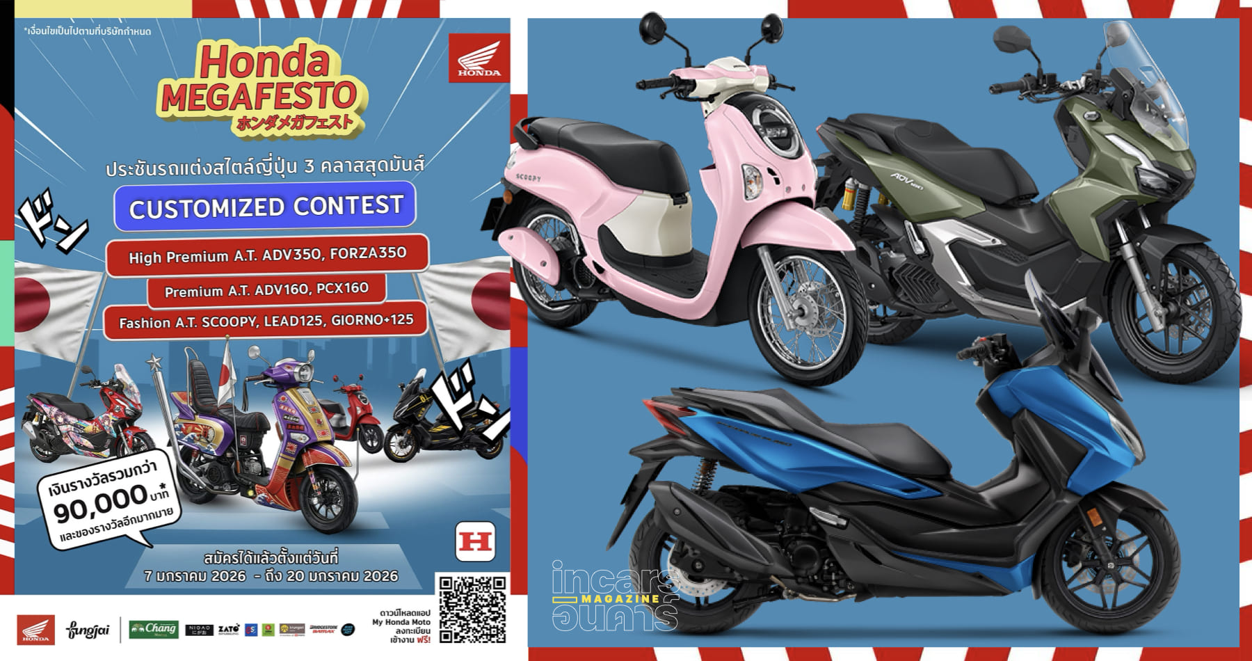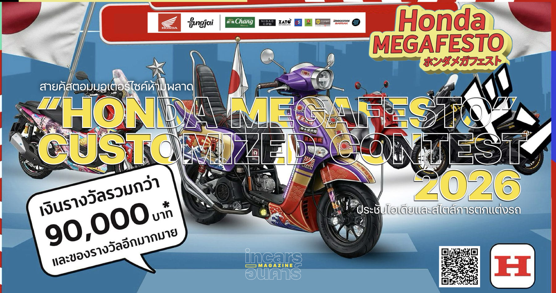 รถจักรยานยนต์ฮอนด้า เปิดเวทีให้สายคัสตอมได้ปล่อยของอย่างเต็มที่ ชวนผู้ใช้รถจักรยานยนต์ Honda A.T. ร่วมประชันไอเดียและสไตล์การตกแต่งรถ ในงาน “Honda MEGAFESTO” CUSTOMIZED CONTEST เวทีประชันรถแต่งสไตล์ญี่ปุ่น 3 คลาสสุดมันส์ การประกวดรถแต่งออโตเมติกสุดยิ่งใหญ่ เปิดโอกาสให้เหล่าคนรักฮอนด้าจากทั่วประเทศได้โชว์ตัวตนผ่านรถคันโปรดตั้งแต่วันนี้ ถึงวันที่ 20 มกราคม 2569 พร้อมลุ้นชิงรางวัลสุดพิเศษ มูลค่ารวมกว่า 90,000 บาท