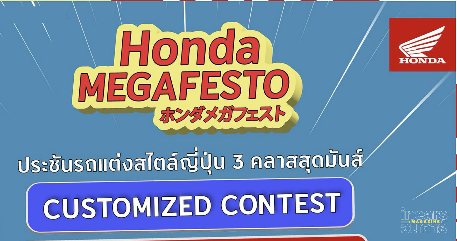 ผู้ที่สนใจเข้าร่วมการแข่งขัน MEGAFESTO CUSTOMIZED CONTEST สามารถสมัครได้ตั้งแต่วันนี้ จนถึงวันที่ 20 มกราคม 2569 (เวลา 23.59 น.) โดยร่วมกิจกรรมผ่าน Facebook เพจ รถจักรยานยนต์ ฮอนด้า เพียงกด Like แฟนเพจ แชร์โพสต์กิจกรรมแบบสาธารณะ และคอมเมนต์ใต้โพสต์ด้วยภาพรถจักรยานยนต์แต่งของตนเอง พร้อมบรรยายแนวคิดหรือจุดเด่นของรถคันโปรด และติดแฮชแท็ก #HondaMegaFesto2026 #รถจักรยานยนตร์ฮอนด้า โดยฮอนด้าจะประกาศผลรถแต่งที่ผ่านการคัดเลือกผ่านทาง Facebook เพจ รถจักรยานยนต์ ฮอนด้า ในวันที่ 21 มกราคม 2569 สามารถอ่านกติกาและรายละเอียดการเข้าร่วมการแข่งขันทั้งหมดได้ที่: https://bit.ly/3LeeugA