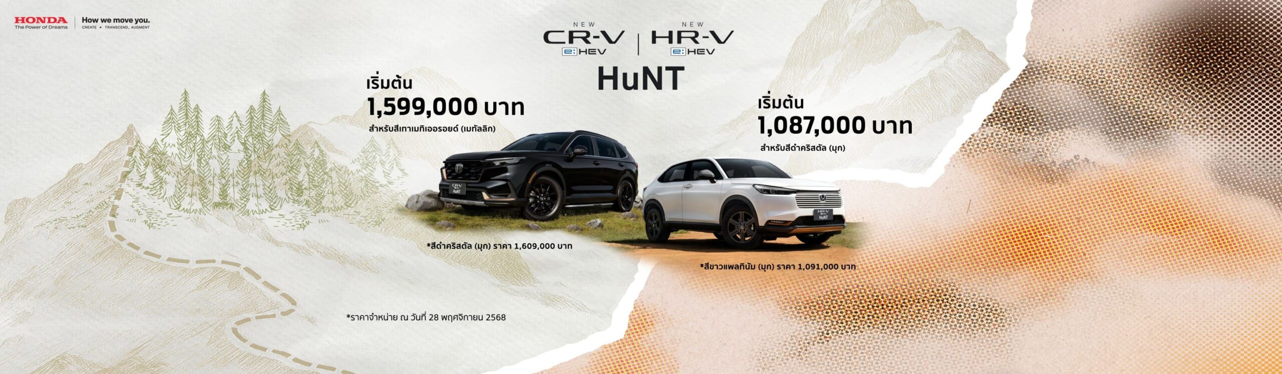 - เปิดตัวไลน์อัป HuNT Series ชุดแต่ง HuNT แพ็กเกจรอบคันที่นำเสนอในรถ SUV ยอดนิยมของฮอนด้า 2 รุ่น ได้แก่ Honda HR-V e:HEV และ Honda CR-V e:HEV ในโฉมอัปลุคพิเศษรุ่น ‘e:HEV HuNT’สะท้อนตัวตนของเหล่า HuNTSTER ผ่านสไตล์เท่ ฟังก์ชันครบ ตอบโจทย์สายลุยที่พร้อมออกค้นหาประสบการณ์ในแบบของตัวเองในทุกการเดินทาง