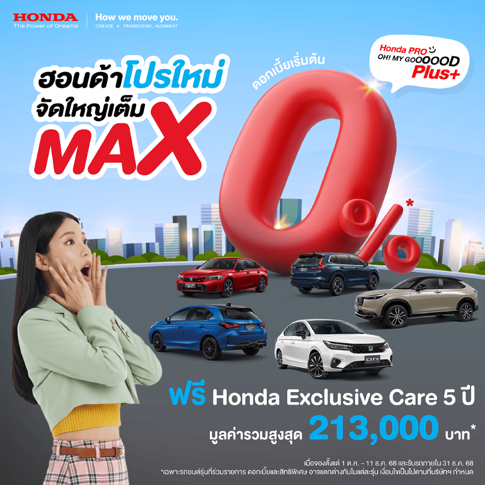โดยทุกรุ่นมาพร้อมขบวนความคุ้มค่าแบบพลัสพลัส จัดใหญ่ส่งท้ายปี กับแคมเปญพิเศษ “Honda Pro OH! MY GOOOOOD PLUS+” โปรใหม่ จัดใหญ่เต็ม MAX จัดเต็มข้อเสนอที่หลากหลาย** สำหรับรถยนต์ฮอนด้าทุกรุ่น อาทิ ดอกเบี้ยพิเศษเริ่มต้นที่ 0% พร้อม Honda Exclusive Care 5 ปี หรือ Double Smile Plus ผ่อนเบา ดาวน์สบาย รวมถึงรับสิทธิพิเศษเพิ่มเติมเฉพาะรุ่นที่ร่วมรายการ** มูลค่า 50,000 – 85,000 บาท เมื่อจองตั้งแต่วันที่ 1 ตุลาคม 2568 – 11 ธันวาคม 2568 และรับรถภายในวันที่ 31 ธันวาคม 2568