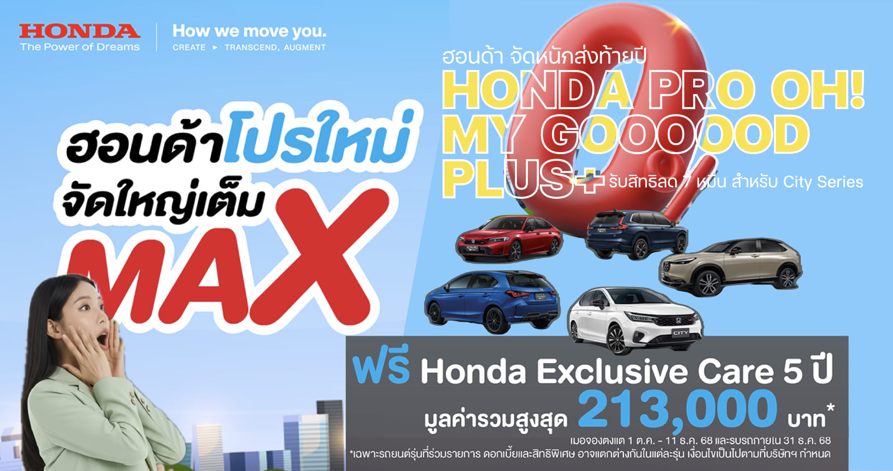 ฮอนด้า จัดหนักส่งท้ายปี รับสิทธิพิเศษเพิ่มเติมสูงสุด 70,000 บาท สำหรับ City Series ผ่านแคมเปญ Honda Pro OH! MY GOOOOOD PLUS+โปรใหม่ จัดใหญ่เต็ม MAX City ซี๊ดดด Deal พร้อมหลากหลายข้อเสนอคุ้มค่า ตั้งแต่ 1 ต.ค. – 11 ธ.ค. 2568
