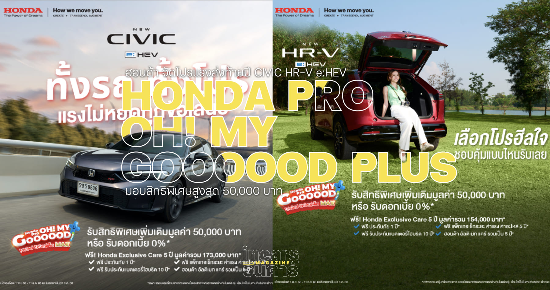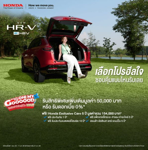 บริษัท ฮอนด้า ออโตโมบิล (ประเทศไทย) จำกัด จัดโปรแรงส่งท้ายปีกับแคมเปญ “Honda Pro OH! MY GOOOOOD PLUS+” เพิ่มเติมทางเลือกใหม่สำหรับรถยนต์สองรุ่นฮิตในไลน์อัป Honda e:HEV – The EXCITING Hybrid ทั้ง Honda Civic e:HEV และ New Honda HR-V e:HEV มอบความคุ้มค่าที่ “ตรงใจ เลือกได้เอง” ให้คุณเลือกได้ดั่งใจรับสิทธิพิเศษเพิ่มเติมมูลค่า 50,000 บาท หรือ เลือกรับดอกเบี้ยพิเศษ 0% พร้อมรับ Honda Exclusive Care 5 ปี มูลค่าสูงสุด 173,000 บาท** ให้การเป็นเจ้าของรถยนต์ทั้งสองรุ่นเป็นเรื่องง่ายกว่าที่เคย สำหรับลูกค้าที่จองรถยนต์ตั้งแต่วันที่ 1 พฤศจิกายน 2568 – 11 ธันวาคม 2568 และรับรถภายในวันที่ 31 ธันวาคม 2568 อย่าพลาด! โปรแรงแห่งปีที่ทำให้ความฝันของคุณเป็นจริง