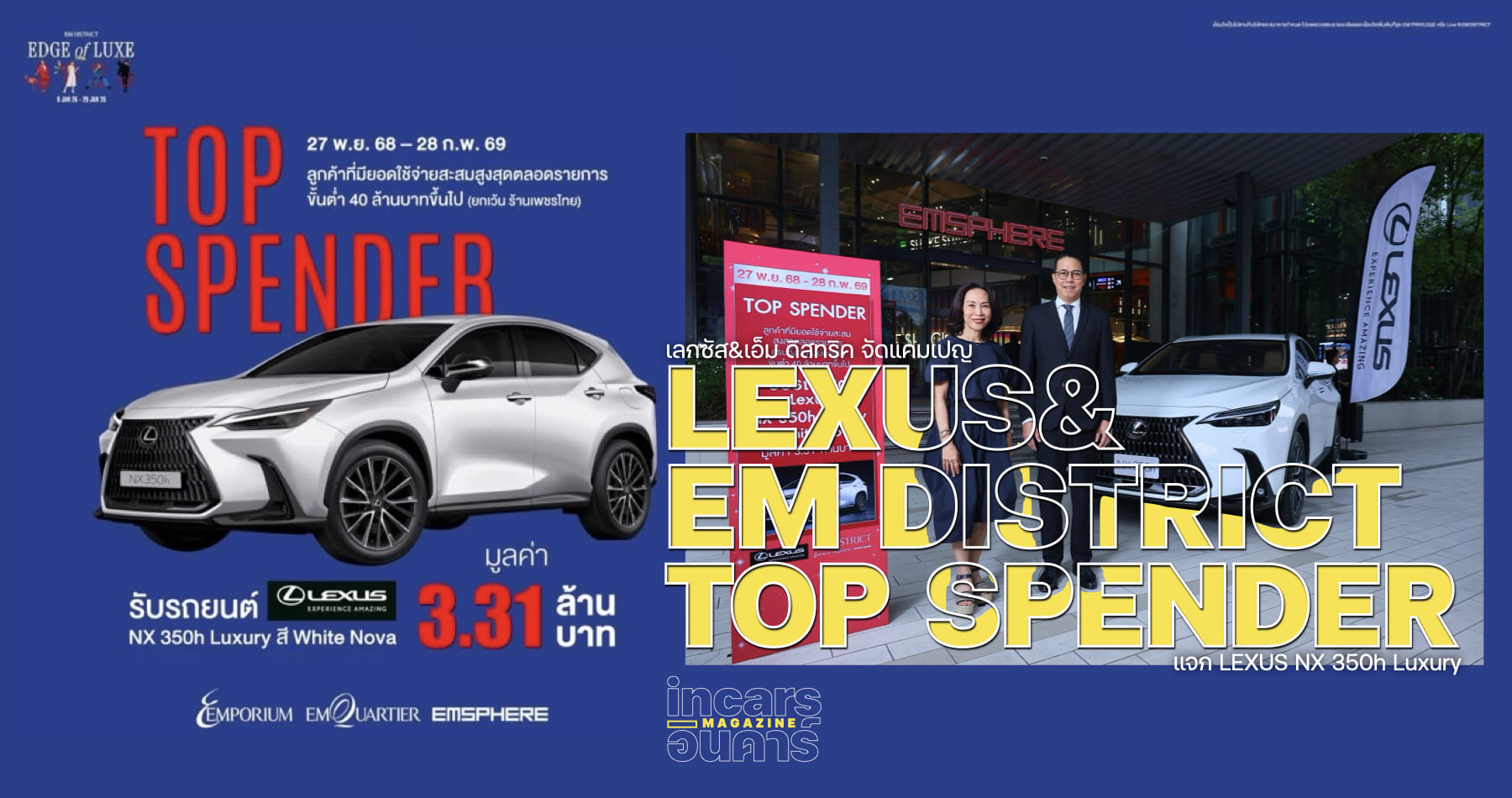 นายณัทธร ศรีนิเวศน์ ผู้ช่วยกรรมการผู้จัดการใหญ่ เลกซัส กรุ๊ป บริษัท โตโยต้า มอเตอร์ ประเทศไทย จำกัด จับมือ นางสุธาวดี ศิริธนชัย กรรมการผู้จัดการสายงานการตลาด เอ็ม ดิสทริค ร่วมจัด แคมเปญใหญ่ “EM DISTRICT Top Spender” ระหว่างวันที่ 27 พฤศจิกายน 2568 – 28 กุมภาพันธ์ 2569 ที่ศูนย์การค้าเอ็มโพเรียม เอ็มควอเทียร์ และเอ็มสเฟียร์ ซึ่งเป็นช่วงเวลาที่มีหลายเทศกาลสำคัญ ทั้งเทศกาลคริสต์มาส ปีใหม่ ตรุษจีน ที่ลูกค้ามีความตื่นตัวในการจับจ่ายสูง โดยลูกค้าที่มียอดใช้จ่ายสะสมรวมทั้ง 3 ศูนย์การค้าฯ ตลอดทั้งแคมเปญ ขั้นต่ำ 40 ล้านบาทขึ้นไป รับรางวัลพิเศษ รถยนต์ LEXUS NX 350h Luxury สี White Nova มูลค่า 3.31 ล้านบาท เป็นรถครอสโอเวอร์ระบบไฮบริดรุ่นยิดนิยมของเลกซัส ขับเคลื่อนด้วยเครื่องยนต์เบนซินขนาด 2.5 ลิตร 4 สูบ ผสานกับมอเตอร์ไฟฟ้า ให้กำลังรวมสูงสุด 240 แรงม้า เน้นความหรูหรา ประหยัดน้ำมัน และเทคโนโลยีล้ำสมัย สำหรับคนรุ่นใหม่ที่รักการขับขี่ในระดับพรีเมี่ยม