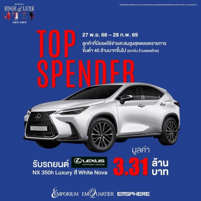 เลกซัส ประเทศไทย จับมือ เอ็ม ดิสทริค ย่านการค้าสำคัญระดับโลก ประกอบด้วยศูนย์การค้าเอ็มโพเรียม เอ็มควอเทียร์ และเอ็มสเฟียร์ สร้างความคึกคักตลาดต้นปี 2569 จัดแคมเปญใหญ่ “EM DISTRICT Top Spender” แจกรถยนต์ LEXUS NX 350h Luxury มูลค่า 3.31 ล้านบาท ให้กับสุดยอดนักช้อปที่มียอดใช้จ่ายสูงสุดตลอดแคมเปญ ระหว่างวันที่ 27 พฤศจิกายน 2568 – 28 กุมภาพันธ์ 2569 ที่ศูนย์การค้าเอ็มโพเรียม เอ็มควอเทียร์และเอ็มสเฟียร์ หวังดึงดูดลูกค้าให้เข้ามาใช้บริการศูนย์การค้าอย่างต่อเนื่องตลอดช่วงเทศกาล