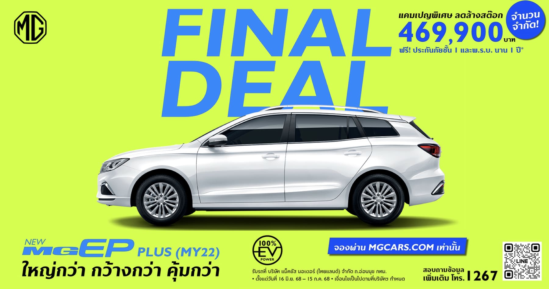 ห้ามพลาด!! โอกาสดี ๆ ที่ไม่ได้มีบ่อย ๆ กับ MG EP PLUS ที่พร้อมให้คนไทยเป็นเจ้าของความคุ้มค่าแล้ววันนี้!โดยมีสีตัวถังให้เลือก 4 สี ได้แก่ สีขาว (Arctic White) สีดำ (Black Knight) สีแดง (Scarlet Red) และสีเทา (Metallic Grey) โดยสามารถจองผ่าน https://bit.ly/MGEP-Final-Deal เลือกเมนูจองออนไลน์