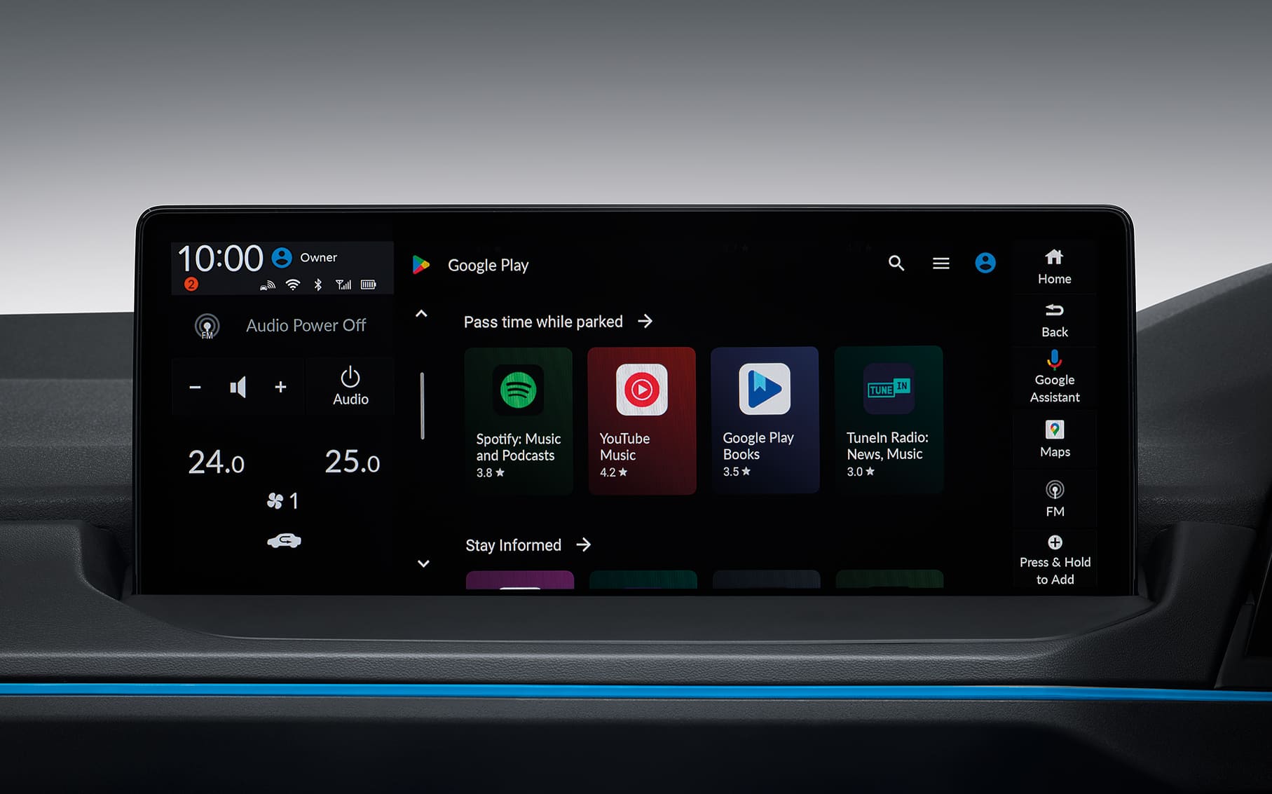หากต้องการดาวน์โหลดแอปสื่อ ให้ตรวจสอบว่ารถจอดอยู่กับที่ เชื่อมต่ออินเทอร์เน็ตอยู่ และลงชื่อเข้าใช้บัญชี Google แล้วเริ่มต้นใช้งานด้วยแอปที่เราชื่นชอบ