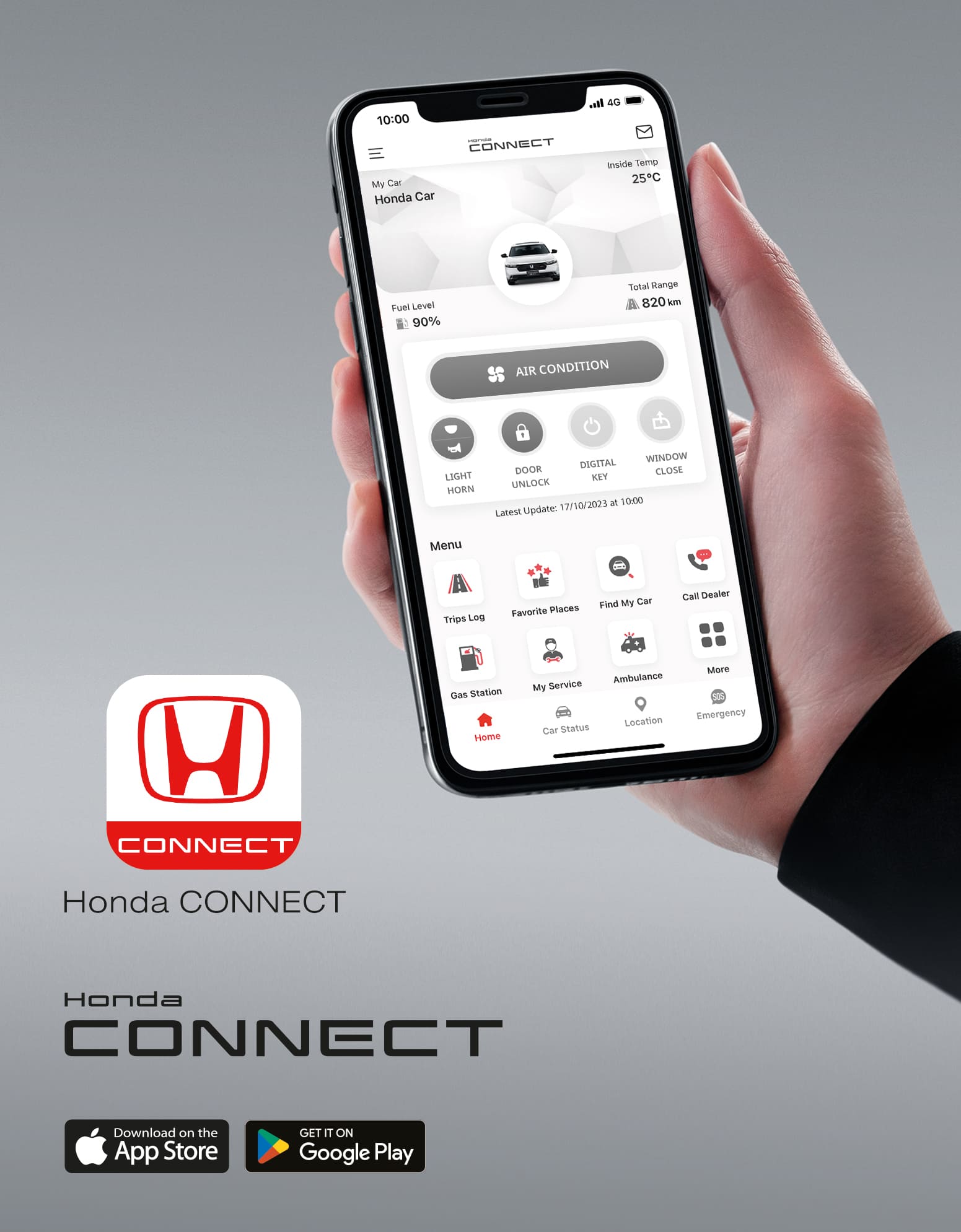 โดย ฮอนด้า คอนเนค (Honda CONNECT) เทคโนโลยีเชื่อมต่อเพื่อการสื่อสารระหว่างผู้ขับขี่และรถยนต์ ทำงานผ่านแอปพลิเคชันบนสมาร์ตโฟน มาพร้อมหลากหลายฟังก์ชันการทำงานที่จะช่วยอำนวยความสะดวก และเพิ่มความปลอดภัยตลอดการเดินทาง ได้แก่