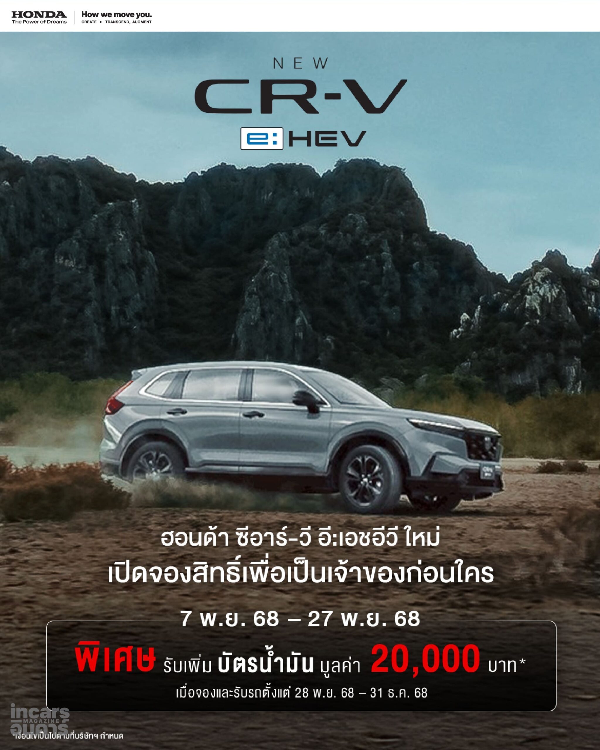 ครั้งแรก! กับรุ่นย่อยใหม่ e:HEV HuNT กับดีไซน์อัปลุคสะท้อนไวบ์ที่แตกต่างอีกขั้น และรุ่นย่อย e:HEV RS ที่มาพร้อมระบบขับเคลื่อน 2 ล้อ เพื่อตอบโจทย์ทุกความต้องการลูกค้าอย่างลงตัว พิเศษ! รับฟรีบัตรเติมน้ำมันมูลค่า 20,000 บาท*** พร้อมรับดอกเบี้ย 0.99%*** และฟรีประกันภัย 1 ปี สำหรับลูกค้าที่ลงทะเบียนจองสิทธิ์ล่วงหน้าเพื่อเป็นเจ้าของ Honda CR-V e:HEV ใหม่ ผ่านทางที่ปรึกษาการขายฮอนด้าที่โชว์รูมฮอนด้าทั่วประเทศ ตั้งแต่วันที่ 7 พฤศจิกายน 2568 – 27 พฤศจิกายน 2568 พร้อมจองและรับรถตั้งแต่วันที่ 28 พฤศจิกายน 2568 – 31 ธันวาคม 2568***เตรียมพบกับการประกาศราคาจำหน่ายอย่างเป็นทางการของ Honda CR-V e:HEV ใหม่ ในวันที่ 28 พฤศจิกายน 2568 รวมถึงสัมผัสได้ที่บูทฮอนด้า (A08) ในงาน Motor Expo 2025 ระหว่างวันที่ 29 พฤศจิกายน 2568 – 10 ธันวาคม 2568 และโชว์รูมฮอนด้าทั่วประเทศ
