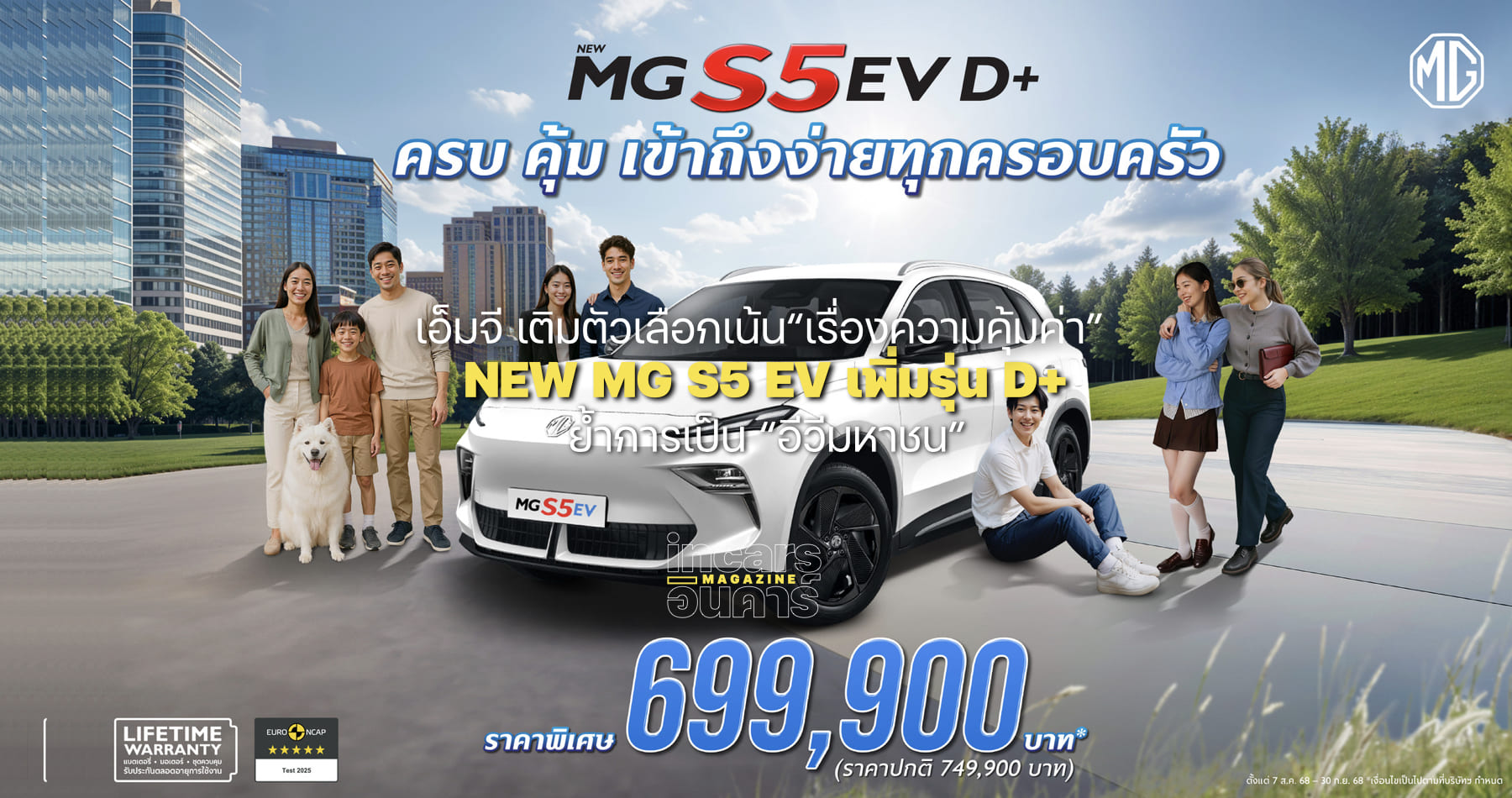 บริษัท เอสเอไอซี มอเตอร์ – ซีพี จำกัด และ บริษัท เอ็มจี เซลส์ (ประเทศไทย) จำกัด ผู้ผลิตและผู้จำหน่ายรถยนต์เอ็มจีในประเทศไทย ปรับรุ่นย่อยใหม่ให้กับรถไฟฟ้าอเนกประสงค์ (B – SUV) ที่ตอบโจทย์ลูกค้ายุคใหม่ที่เน้นความคุ้มค่า กับ NEW MG S5 EV D+ มาพร้อมเทคโนโลยีที่ตอบโจทย์ไลฟ์สไตล์การขับขี่ และมาตรฐานความปลอดภัยที่จำเป็น สร้างมาตรฐานใหม่ของ “ความคุ้มค่า” ที่ทุกคนเข้าถึงได้ พร้อมความมั่นใจกับการรับประกันแบตเตอรี่แรงเคลื่อนสูง ชุดมอเตอร์ขับเคลื่อน และชุดควบคุมมอเตอร์ขับเคลื่อนตลอดอายุการใช้งาน (LIFETIME WARRANTY) รองรับทุกจังหวะของการเดินทางในทุกเส้นทางได้อย่างลงตัว ด้วยราคาพิเศษเพียง 699,900 บาท