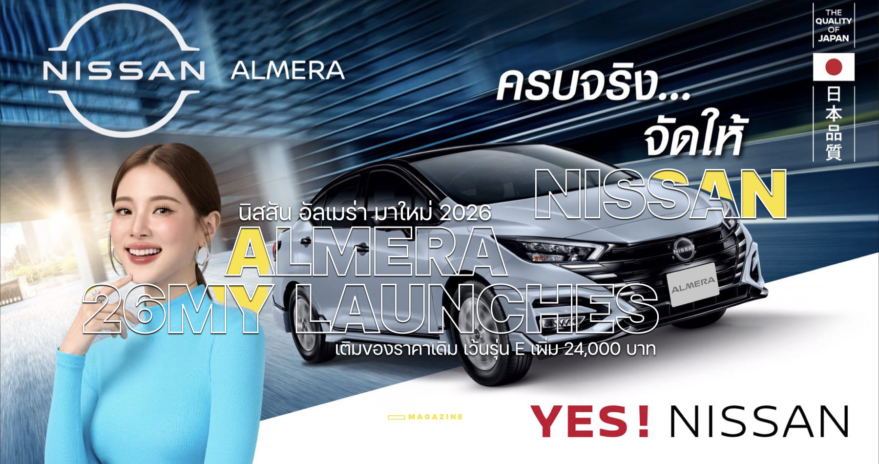 ทาคาอากิ ยานางิ รองประธานอาวุโส นิสสัน ประเทศไทย กล่าวว่า “นิสสัน อัลเมร่า เป็นหนึ่งในรถยนต์รุ่นยอดนิยมที่ผู้ขับขี่ชาวไทยให้ความไว้วางใจมาตลอด ด้วยเครื่องยนต์ที่ตอบสนองทันใจ ดีไซน์สปอร์ตสุดโดดเด่น ภายในกว้างขวาง ประโยชน์ใช้สอยครบครัน และเทคโนโลยีความปลอดภัยที่ตอบโจทย์ทุกการขับขี่ในชีวิตประจำวัน โดย นิสสัน อัลเมร่า รุ่นปี 2026 ได้ต่อยอดจุดเด่นเหล่านี้ผ่านการพัฒนาอย่างรอบด้าน สะท้อนถึงความมุ่งมั่นของนิสสันต่อตลาดประเทศไทยในการยกระดับรถยนต์รุ่นหลักอย่างต่อเนื่อง พร้อมสร้างความคึกคักให้กับตลาดรถยนต์อย่างสม่ำเสมอ”