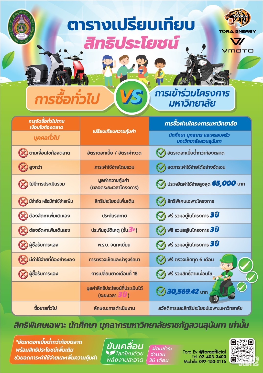 สาระสำคัญของโครงการนี้ คือการมอบสิทธิประโยชน์ที่ “ดีกว่าการซื้อรถจักรยานยนต์ทั่วไปในท้องตลาด” อย่างเห็นได้ชัด โดยเฉพาะเมื่อเปรียบเทียบด้านภาระค่าใช้จ่ายในระยะยาว การซื้อทั่วไปมักต้องแบกรับอัตราดอกเบี้ยตามตลาด ค่าใช้จ่ายแฝงด้านประกัน การบำรุงรักษา และค่าดำเนินการต่าง ๆ ขณะที่การเข้าร่วมโครงการผ่านมหาวิทยาลัยช่วยลดภาระเหล่านี้ได้อย่างเป็นรูปธรรม สำหรับบุคลากรทางการศึกษา นักศึกษา และครอบครัวสวนสุนันทาที่เข้าร่วมโครงการ จะได้รับสิทธิพิเศษ อาทิ ฟรีดาวน์ ผ่อนชำระยาวสูงสุด 48 เดือน อัตราผ่อนที่ออกแบบให้เหมาะกับรายได้ ลดภาระรายเดือนอย่างชัดเจน พร้อมประกันตัวรถและแบตเตอรี่ยาวนานถึง 4 ปี รวมถึงสิทธิประโยชน์ด้านการดูแลรักษาและบริการหลังการขายภายใต้เงื่อนไขโครงการ ซึ่งแตกต่างจากการซื้อทั่วไปที่ผู้ซื้อจำเป็นต้องรับภาระค่าใช้จ่ายเหล่านี้ด้วยตนเอง