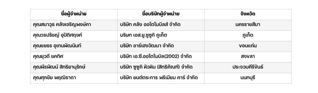 สำหรับแนวทางในการแข่งขันทางซูซูกิได้ทำการคัดเลือกผู้จำหน่ายรถยนต์ซูซูกิจากทั่วประเทศ เพื่อเป็นผู้จำหน่ายยอดเยี่ยมแห่งปี 2024 จำนวน 7 แห่ง โดยพิจารณาจากคุณสมบัติและผลการดำเนินงานของผู้จำหน่ายในรอบปีที่ผ่านมาตามเกณฑ์ที่บริษัทฯ กำหนดก่อนจะทำการแข่งขันกันอย่างเข้มข้น ผ่านการนำเสนอวิสัยทัศน์และแนวทางการดำเนินงานของผู้จำหน่ายแต่ละแห่ง แบ่งออกเป็นรางวัล Best of the Best Dealer 2024 จำนวน 1 รางวัล และรางวัล Platinum Dealer 2024 จำนวน 6 รางวัล ซึ่งได้รายชื่อผู้จำหน่ายยอดเยี่ยมแห่งปีที่ผ่านการแข่งขันและตัดสินอย่างเป็นเอกฉันท์ ดังนี้