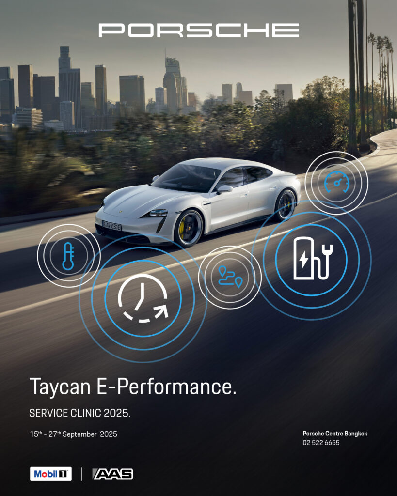 แคมเปญพิเศษนี้จัดขึ้นเมื่อวันที่ 15 – 27 กันยายน 2568 ณ Porsche Centre Bangkok และ Porsche Centre Pattanakarn ครอบคลุมรถยนต์ ปอร์เช่ ไทคานน์ (Taycan) ในโมเดล J1.I ภายใต้แนวคิด ‘AAS Looking After YOU and Your Car’ ตอกย้ำพันธกิจของเอเอเอสฯ ในการดูแลรถยนต์ทุกคันของสมาชิกครอบครัวเอเอสฯ อย่างใส่ใจในทุกรายละเอียด