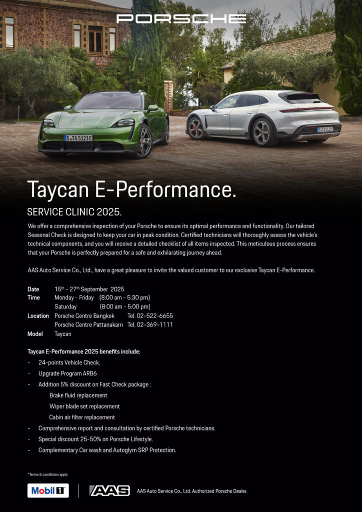 เอเอเอส ออโต้ เซอร์วิส ตัวแทนจำหน่ายรถยนต์ปอร์เช่อย่างเป็นทางการแห่งแรกในประเทศไทยและศูนย์บริการมาตรฐานจากโรงงานปอร์เช่ ประเทศเยอรมนี เชิญเจ้าของรถยนต์ปอร์เช่เข้ารับบริการตรวจเช็กสภาพรถยนต์ เพื่อความมั่นใจในการเดินทาง โดยเฉพาะกับรถยนต์พลังงานไฟฟ้าอย่าง ปอร์เช่ ไทคานน์ (Taycan) ที่มาพร้อมเทคโนโลยีล้ำสมัย จึงควรได้รับการดูแลด้วยมาตรฐานที่แม่นยำและเฉพาะทาง ผ่านแคมเปญ “Taycan E-Performance Service Clinic 2025” ซึ่งให้บริการโดยทีมช่างผู้เชี่ยวชาญที่ผ่านการรับรองจากโรงงานปอร์เช่โดยตรง พร้อมอุปกรณ์ตรวจเช็กเฉพาะสำหรับรถยนต์ไฟฟ้าโดยเฉพาะ