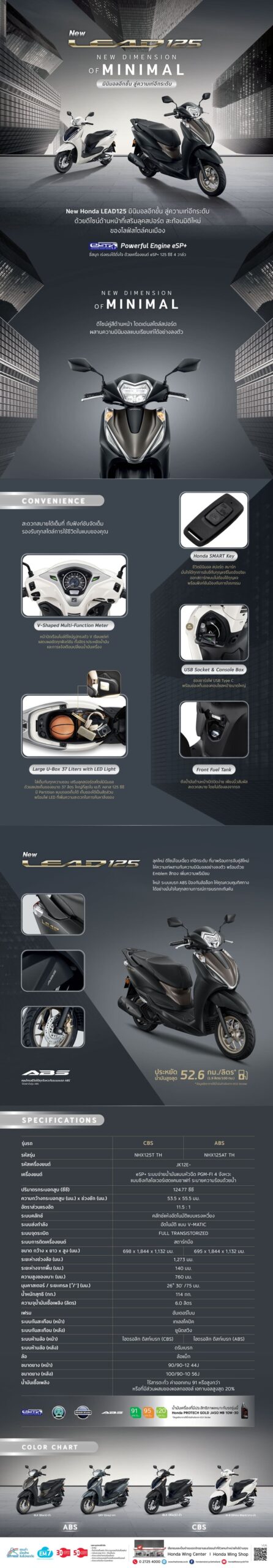 ด้านสมรรถนะ New Honda LEAD125 เพิ่มระบบเบรก ABS ช่วยป้องกันล้อล็อกขณะเบรกกะทันหัน เพิ่มความมั่นใจและความปลอดภัยในการขับขี่ สนุกเร่งความแรงได้ดั่งใจ ด้วยเครื่องยนต์ eSP+ 125 ซีซี 4 วาล์ว และประหยัดน้ำมันสูงถึง 52.6 กม./ลิตร มาพร้อมฟังก์ชันจัดเต็มเพิ่มความสะดวกสบายรองรับทุกสไตล์การใช้ชีวิต ไม่ว่าจะเป็น Honda SMART Key กุญแจรีโมตอัจฉริยะ, หน้าจอเรือนไมล์ V-Shaped Multi-Function Meter ดีไซน์รูปทรงตัว V เรียบเท่ แสดงผลชัดทุกฟังก์ชัน ทั้งอัตราประหยัดน้ำมัน และการแจ้งเตือนเปลี่ยนน้ำมันเครื่อง, ช่องชาร์จ USB Socket พร้อม Console Box สำหรับจัดเก็บของใช้จำเป็น, เติมน้ำมันได้สะดวกด้วย Front Fuel Tank ถังน้ำมันด้านหน้า รวมถึงจุดเด่นอย่าง Large U-Box ขนาดใหญ่ 37 ลิตร พร้อมไฟ LED ใต้เบาะ รองรับการใช้งานในเมืองได้อย่างมั่นใจและครบครัน