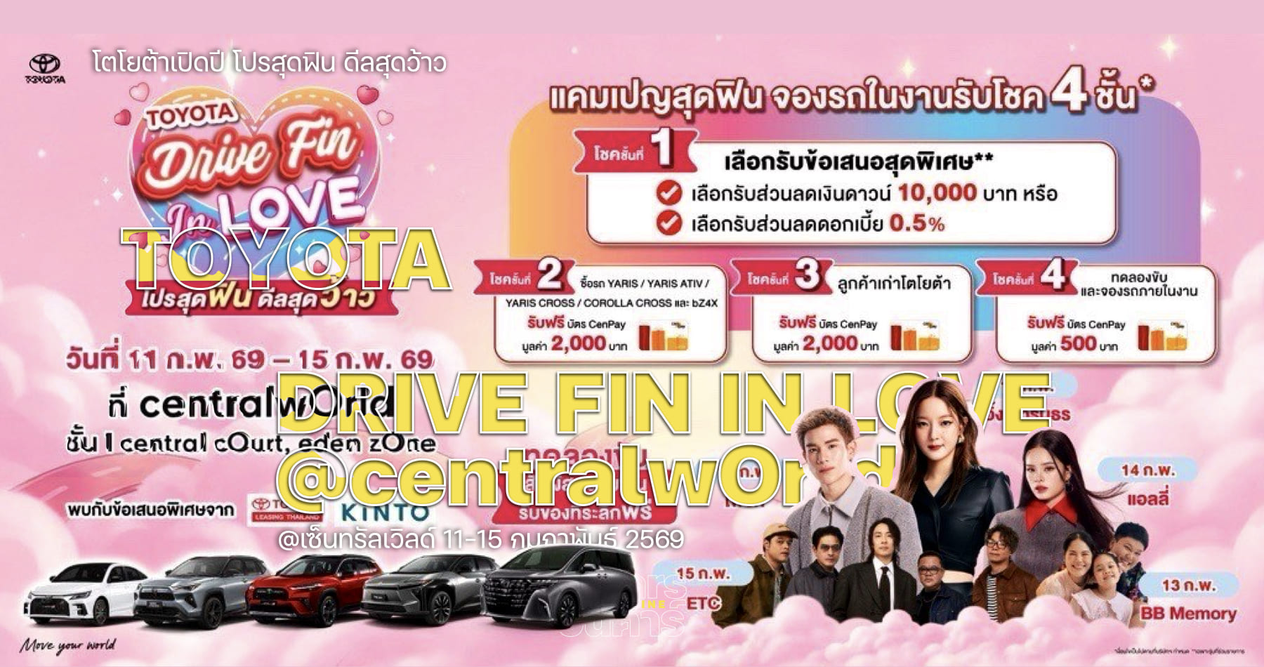 โตโยต้าเดินหน้าเปิดปี 2569 ด้วยอีเวนต์สุดพิเศษเพื่อคนเมืองกับงาน “Drive Fin In Love” โปรสุดฟิน ดีลสุดว้าว จัดเต็มใจกลางกรุงเทพฯ ณ ศูนย์การค้าเซ็นทรัลเวิลด์ ระหว่างวันที่ 11–15 กุมภาพันธ์ 2569 ชั้น 1 Central Court, Eden Zone และ Square A พร้อมเชิญชวนลูกค้าที่กำลังมองหารถคันใหม่ ทั้ง รถยนต์ไฟฟ้า 100% (BEV) และ รถยนต์ไฮบริด (HEV) มาสัมผัสรถจริง ทดลองขับจริง และรับข้อเสนอพิเศษจัดเต็มเฉพาะภายในงานเท่านั้น กิจกรรมนี้จัดเต็มตั้งแต่ ลาน EDEN และ Central Court พร้อมไฮไลท์ใหม่ “ลานทดลองขับ” ที่ลานSquare A หน้า Apple Store กับกิจกรรมทดลองขับรถโตโยต้าตะลุยฐานสุดคิวท์ สัมผัสฟีเจอร์ล้ำและฟีลลิ่งขับขี่ที่คล่องตัวสำหรับคนเมือง พร้อมรับ ดีลสุดว้าว เงื่อนไขดีที่สุด พร้อมจบทุกดีลในงาน