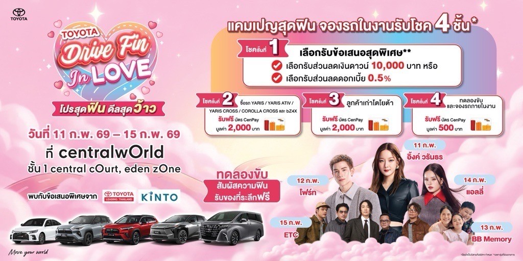 โตโยต้าเปิดปีสุดว้าว! ชวนมางาน “Drive Fin In Love” โปรสุดฟิน ดีลสุดว้าว ที่ เซ็นทรัลเวิลด์ 11–15 กุมภาพันธ์ 2569