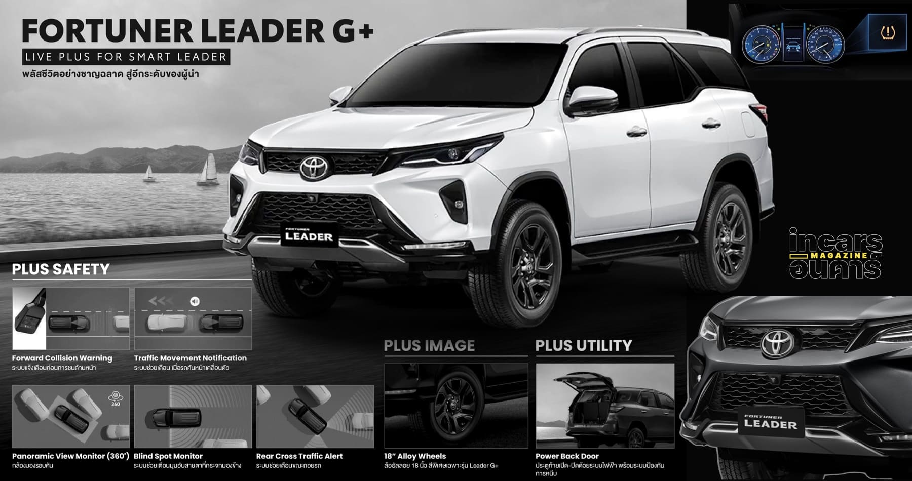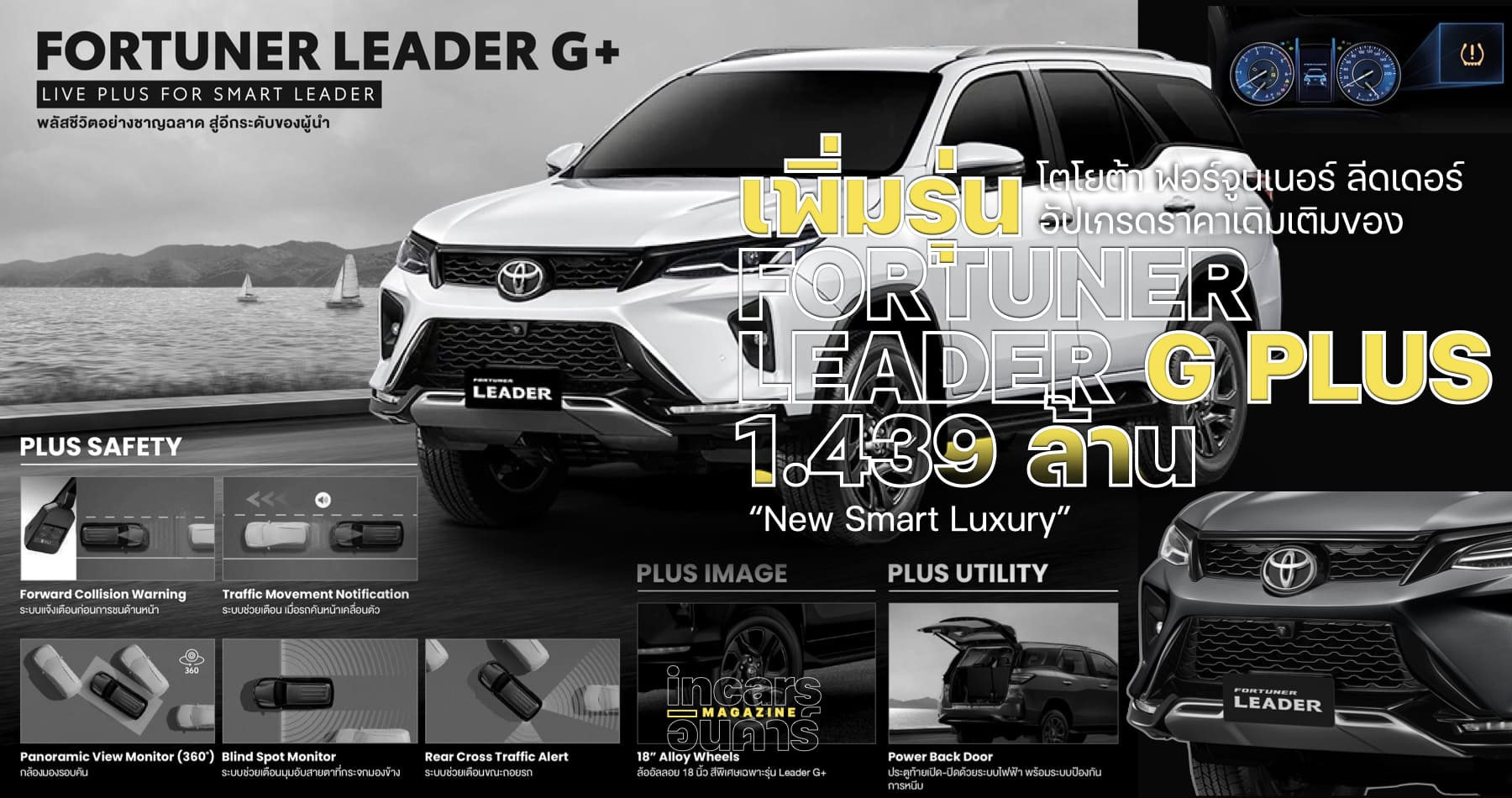 บริษัท โตโยต้า มอเตอร์ ประเทศไทย จำกัด แนะนำรถยนต์อเนกประสงค์ใหม่ล่าสุด Fortuner Leader G Plus เติมเต็มไลน์อัพ ตอกย้ำความเป็นผู้นำตัวจริงในตลาด PPV เพื่อเป็นตัวเลือกสำหรับผู้ที่มองหารถยนต์อเนกประสงค์ที่มีความหรูหราและความคุ้มค่า อัปเกรดสเปกการใช้งานประจำวันให้ครบครันยิ่งขึ้น ตอบโจทย์การใช้งานที่หลากหลาย ในราคาที่จับต้องได้ง่าย เพื่อให้ลูกค้าเข้าถึงความพรีเมียมของ Fortuner ได้มากกว่าเดิม คุ้มค่าด้วยระบบความปลอดภัยขั้นสูง และอุปกรณ์อำนวยความสะดวกครบครัน พร้อมด้วยฟังก์ชันการใช้งานที่ทันสมัย พร้อมกันนี้ในรุ่นย่อย 2.4 Leader ทั้งหมดยังได้ยกระดับระบบช่วยเหลือความปลอดภัยเชิงป้องกัน เพื่อมอบความมั่นใจสูงสุดในการขับขี่ให้แก่ลูกค้า