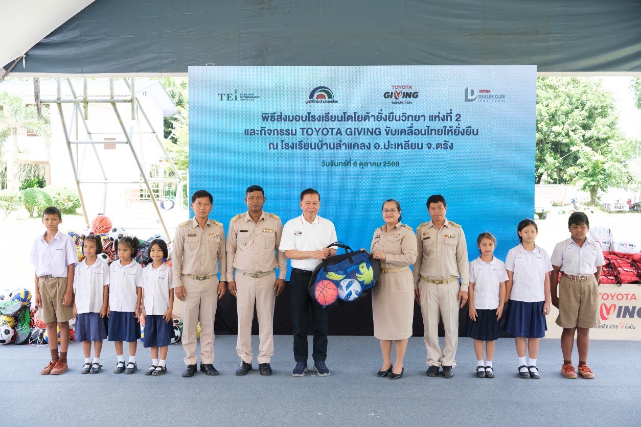 นายประมนต์ สุธีวงศ์ ประธานมูลนิธิโตโยต้าประเทศไทย พร้อมด้วย นายทรงกลด สว่างวงศ์ ผู้ว่าราชการจังหวัดตรัง ดร. ชุลีกร ทองด้วง ผู้อำนวยการสำนักงานเขตพื้นที่การศึกษาประถมศึกษาตรัง เขต 1 นางสาววิศรา หุ่นธานี ผู้อำนวยการฝ่ายมลพิษ พลังงาน และสิ่งแวดล้อม สถาบันสิ่งแวดล้อมไทย  คณะกรรมการมูลนิธิโตโยต้าประเทศไทย คณะผู้บริหารบริษัท โตโยต้า มอเตอร์ ประเทศไทย จำกัด คณะผู้บริหารชมรมผู้แทนจำหน่ายโตโยต้า ร่วมเป็นเกียรติ ในพิธีส่งมอบโรงเรียนยั่งยืนวิทยา แห่งที่ 2 พร้อมมอบอุปกรณ์การเรียน และอุปกรณ์กีฬา ให้แก่นักเรียนในเครือข่าย กลุ่มโรงเรียนปะเหลียน เมื่อวันจันทร์ที่ 6 ตุลาคม พ.ศ.2568 ณ โรงเรียนบ้านลำแคลง จังหวัดตรัง