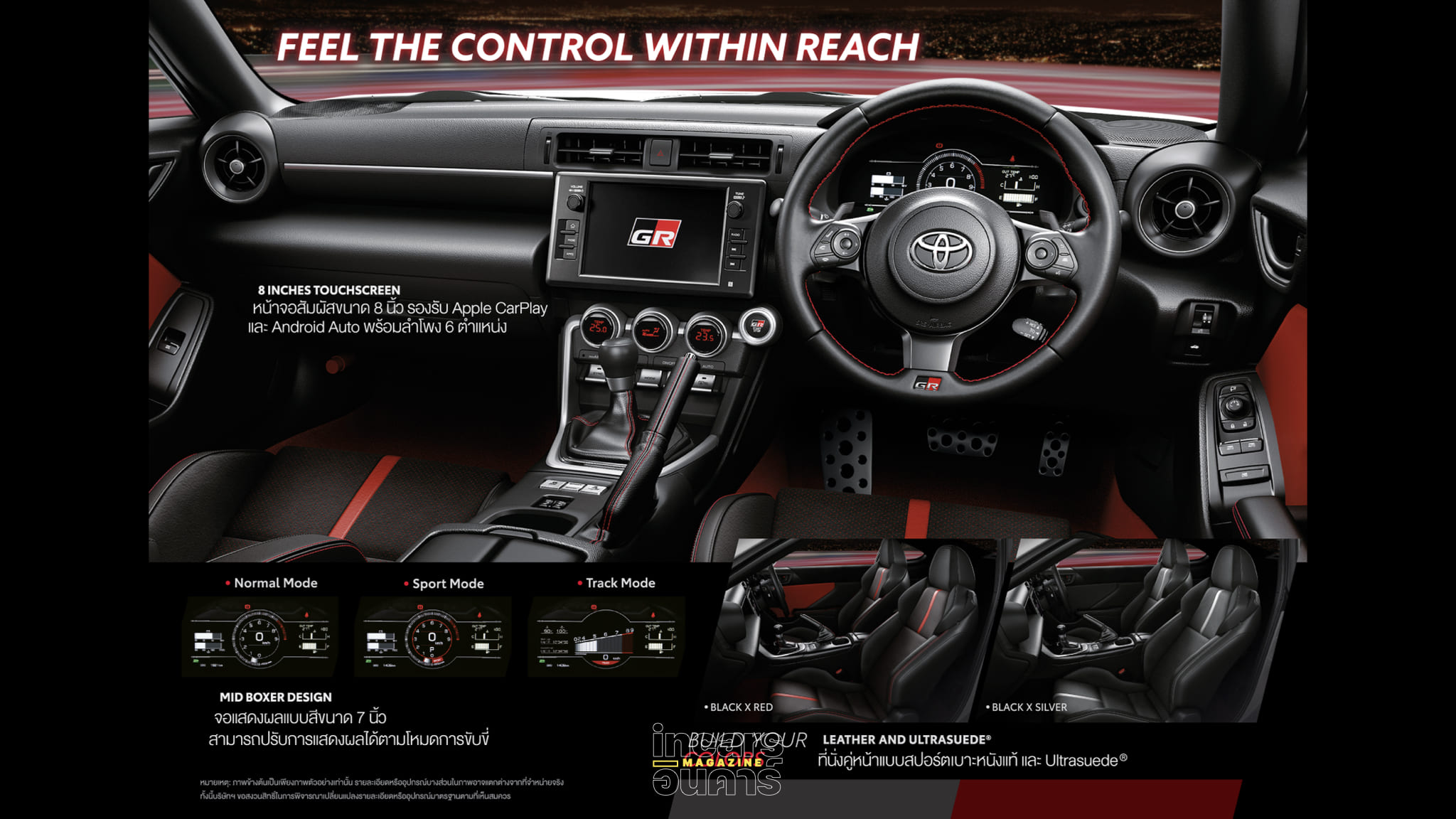 - ภายในห้องโดยสาร เบาะคู่หน้าหุ้มหนังแท้และ Ultrasuede® พร้อมจอแสดงผลแบบสี MID Boxer Design ที่ปรับโหมดการแสดงผลได้ตามสไตล์การขับขี่ — Normal, Sport, หรือ Track และจอสัมผัสขนาด 8 นิ้ว รองรับ Apple CarPlay และ Android Auto พร้อมลำโพง 6 ตำแหน่ง