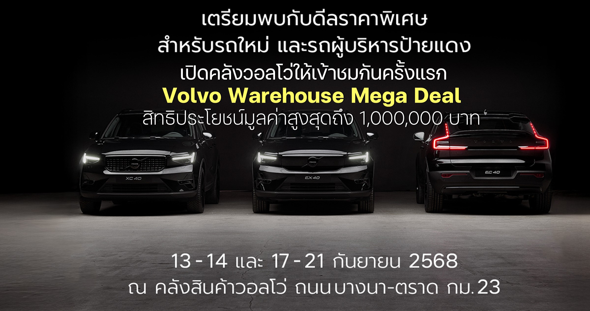 ครั้งแรกจาก วอลโว่ คาร์ ประเทศไทย กับงาน Volvo Warehouse Mega Deal งานที่เปิดโอกาสให้ผู้สนใจสามารถเลือกซื้อรถใหม่วอลโว่ทุกรุ่น ไม่ว่าจะเป็นรถไฟฟ้า 100% อาทิ Volvo EX90, Volvo EX40,  Volvo EC40 และ Volvo EX30  หรือรถปลั๊กอินไฮบริด รุ่น Volvo XC90 โฉมใหม่, Volvo XC90, Volvo XC60 และ Volvo S90 หรือรถผู้บริหาร รถป้ายแดงไมล์น้อย (Volvo Selekt) ถึงคลังสินค้า โดยไม่เพียงลูกค้าสามารถเลือกรุ่นรถ สเปค หรือสีที่ต้องการ แต่ยังสามารถเลือกแคมเปญส่งเสริมการขายที่ปรับได้ดั่งใจบนสิทธิประโยชน์มูลค่า 200,000 – 1,000,000 บาท (แล้วแต่รุ่น) และข้อเสนอเพิ่มเติมในงานซึ่งจะจัดขึ้น ระหว่างวันที่ 13 – 14 และ 17 – 21 กันยายน พ.ศ. 2568 ตั้งแต่เวลา 10.00 – 18.00 น. ณ คลังสินค้าวอลโว่ ถนนบางนา-ตราด กม. 23